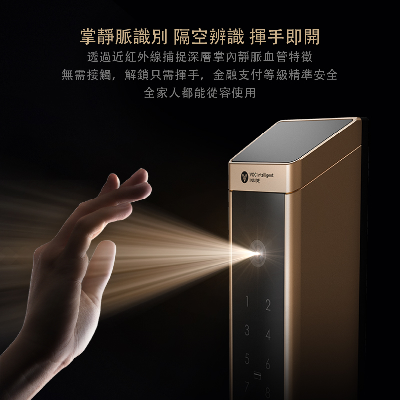 P988 Elite 是 VOC 目前最頂規的旗艦型電子門鎖,整合十合一智慧功能,搭載3D AI 人臉辨識與掌靜脈解鎖技術,即使在低光源環境下也能精準辨識,讓開鎖成為揮手間的優雅動作。近紅外線掃描可對應獨一無二的靜脈分布,提供無法複製的專屬身分驗證。