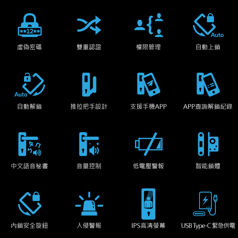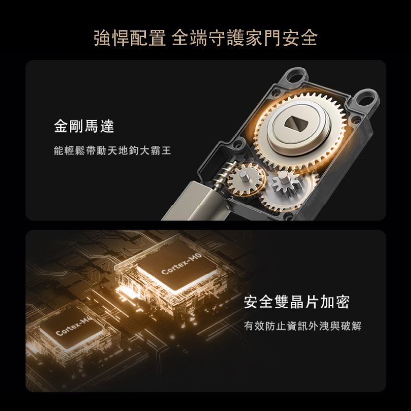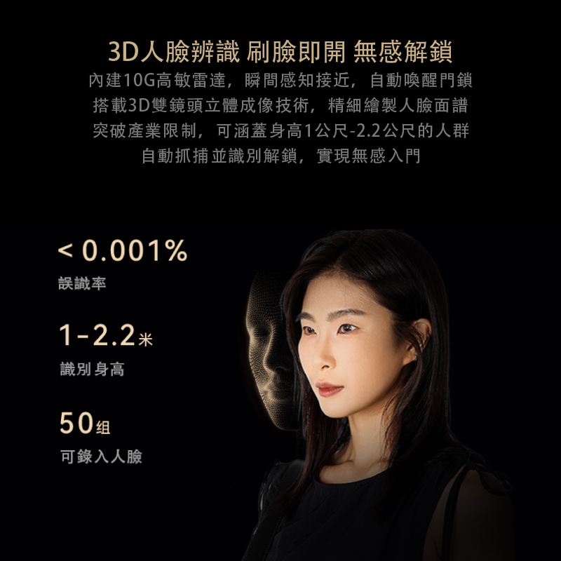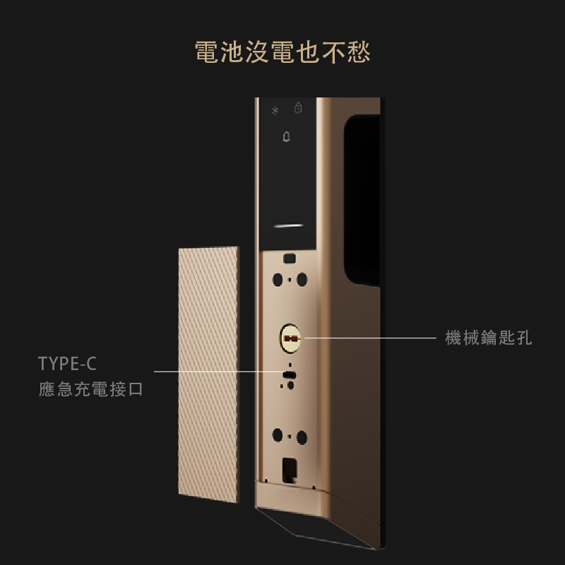 全機航空鋁外殼+強化玄武崑崙玻璃,使用5000mAh 大容量鋰電池,支援低電提醒與低功耗快醒技術。搭配精雕質感設計,適用市面上多數門型,展現極致科技與低調奢華。