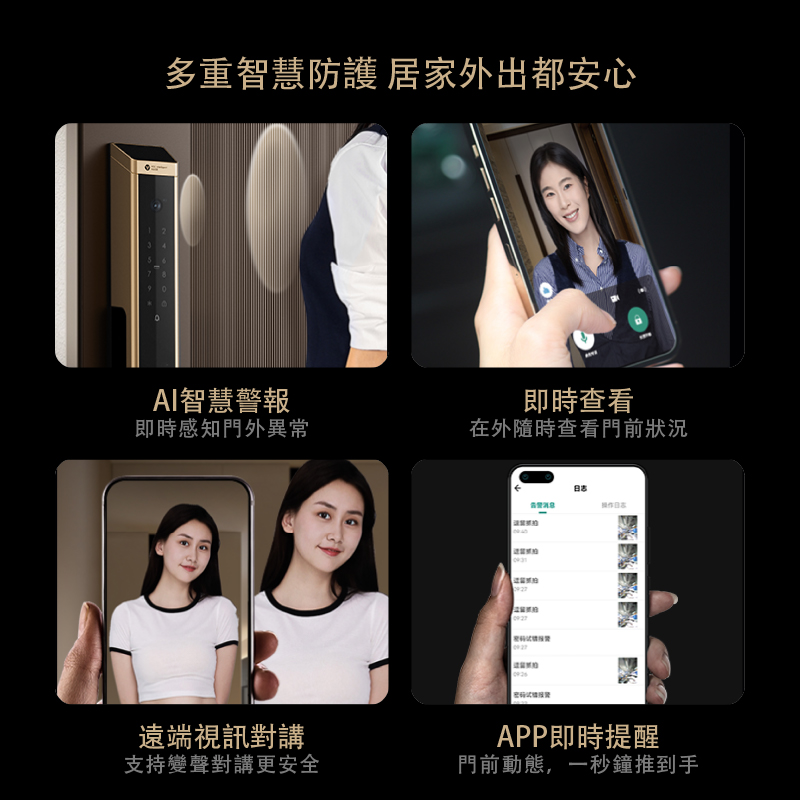 內建螢幕與電子貓眼支援遠端視訊通話,透過手機 App 即時監控門前動態,當訪客按鈴時自動推播通知、拍攝照片,並可遠端語音通話。即便外出,也能第一時間掌握門前安全情況。手機 App 另支援成員回家時間紀錄,貼心守護居家生活。