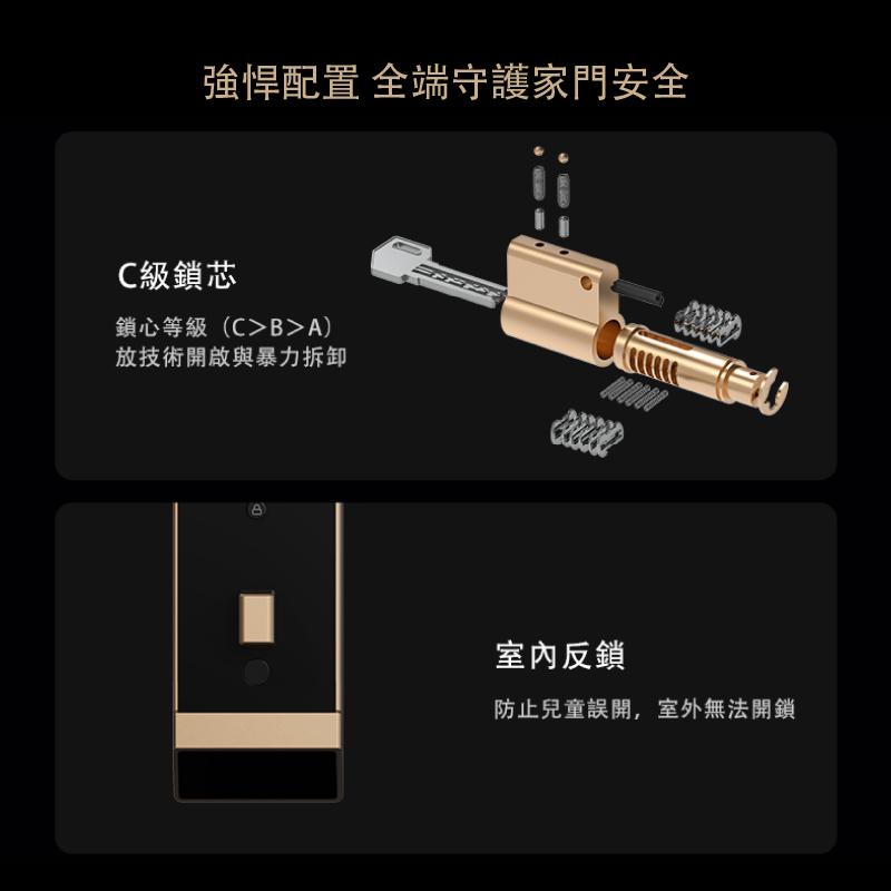 - 啟動內鎖安全旋鈕,管理者及機械鑰匙無法從外面打開