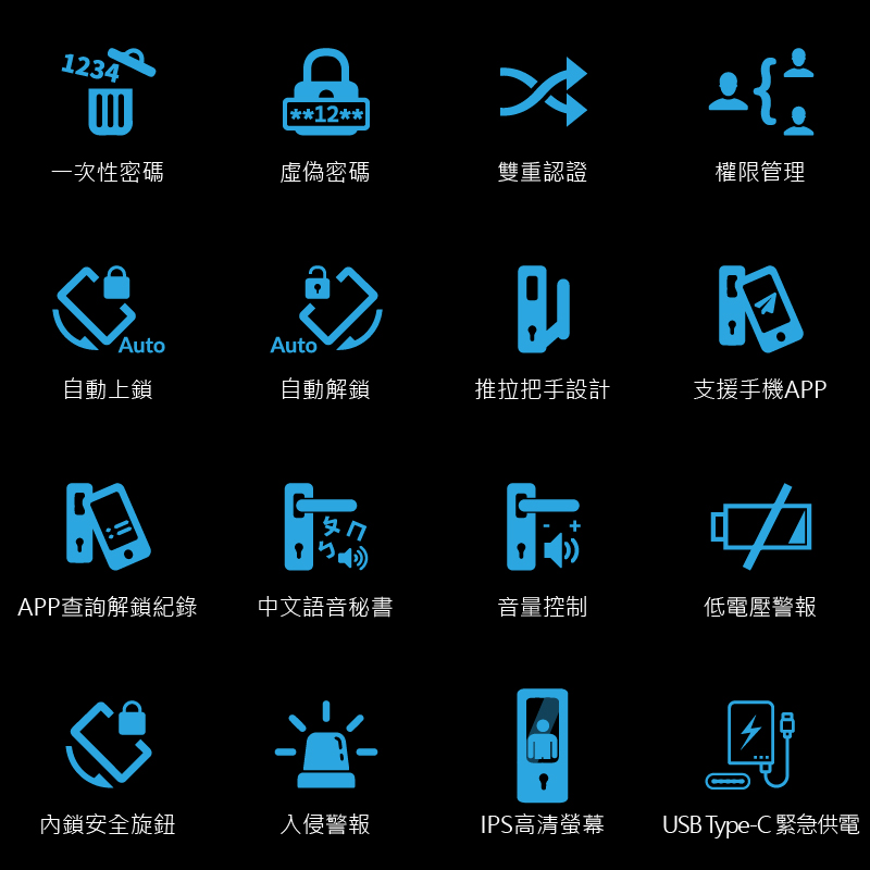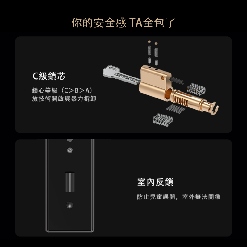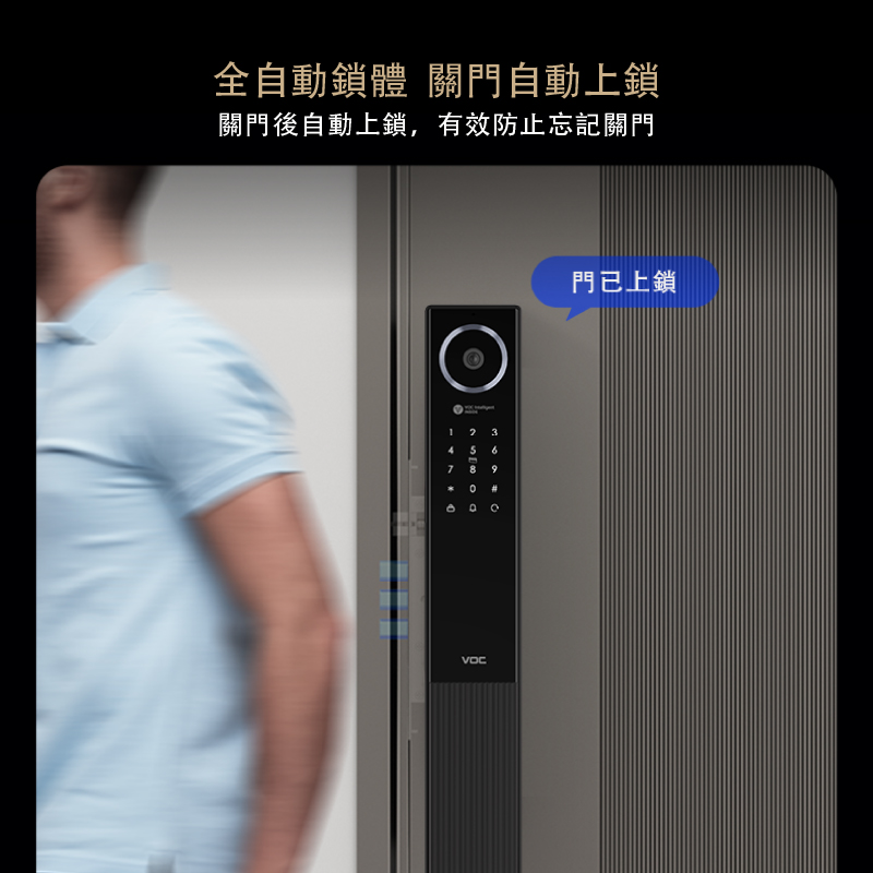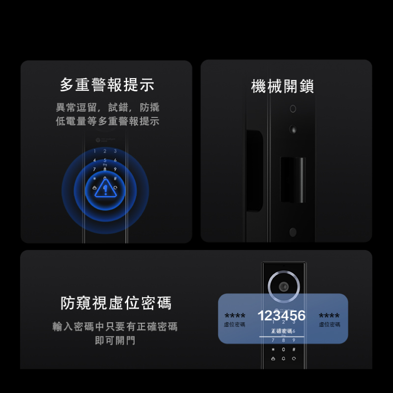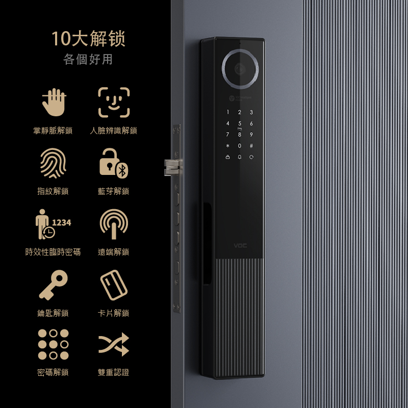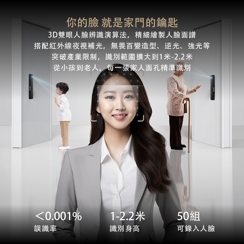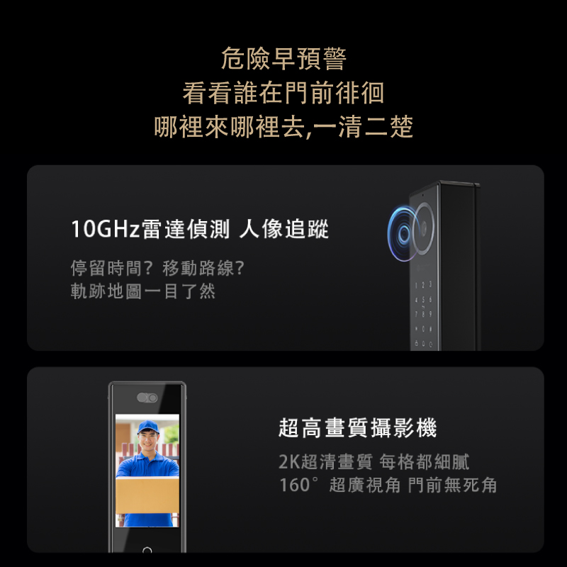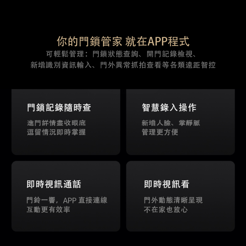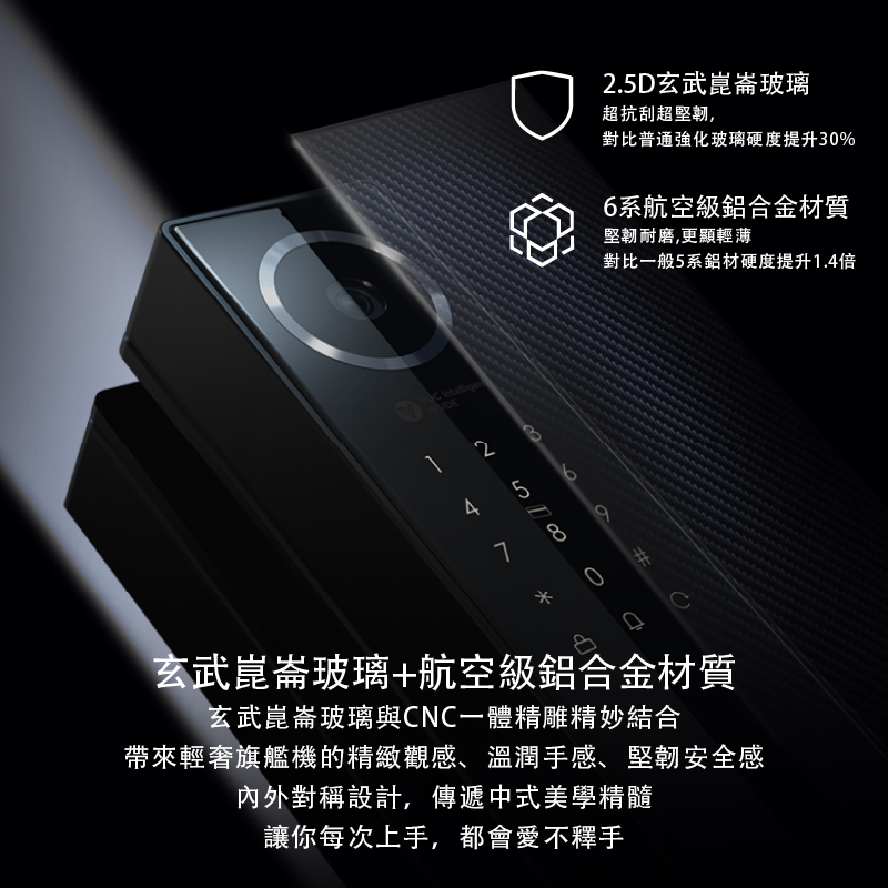 視訊鏡頭具備紅外線功能,可全天候看清門外視野,支援AI人臉識別演算法,能辨識各種面容資訊,下次使用時能更快速完成辨識,鎖體內建5,000mAh大容量鋰電池,充滿一次電約可使用 60 天,當電量過低時,手機App自動推播低電通知,內、外門鎖採用鋁合金材質,面板表面強化鏡面玻璃。同時搭配全黑配色,給人一種低調奢華的感覺,適用市面上絕大多數的門扇。