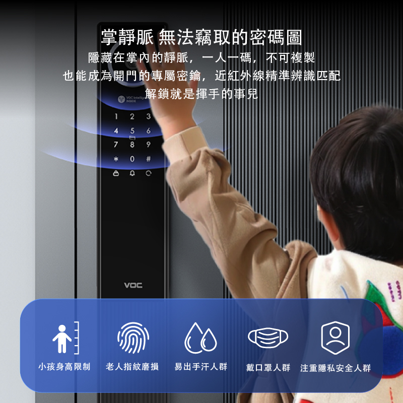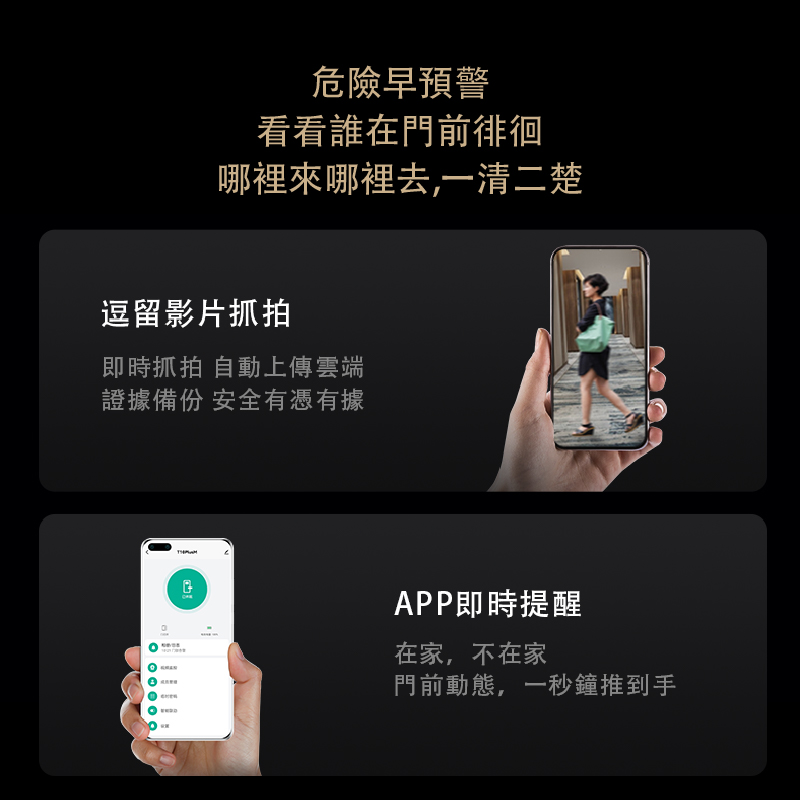 P908 Vision 3D人臉辨識功能強大,不管環境光線如何,都能精準辨識。指紋鎖和密碼鎖功能也很實用,滿足不同場景需求,隱藏在掌內的靜脈,一人一碼,不可複製,也能成為開門的專屬密鑰,近紅外線精準識別匹配,解鎖就是揮個手的事。P908 Vision它的外觀設計簡約時尚,能融入各種居家風格,讓你的家會更有智慧、更美觀,內鎖螢幕會自動喚醒讓家中成員一眼看清楚門外的狀況;當有訪客按下門鈴時,手機APP會自動推播可透過手機APP遠端與訪客視訊溝通,且讓主人看清楚門外的狀況,確認訪客後再開門提升居家安全,當外出時;當發現有人在門前逗留時,鎖體拍攝照片並推播警報訊息至手機App ;手機APP還能自動記錄成員回家時間,掌握家人每天的回家時間。