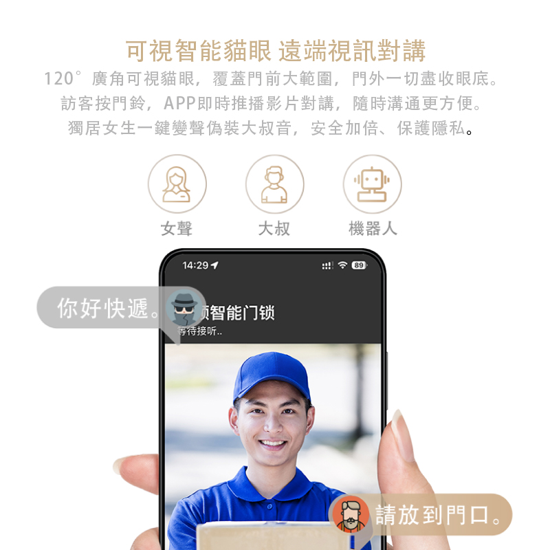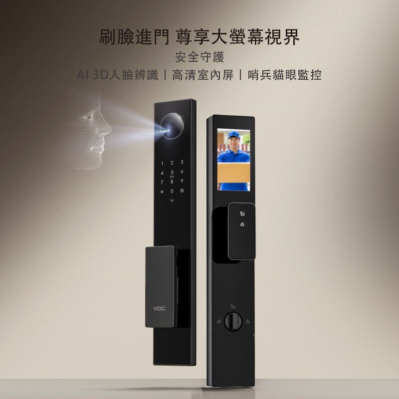 VOC E20 Smart 3D人臉辨識功能強大,不管環境光線如何,都能精準辨識。指紋鎖和密碼鎖功能也很實用,滿足不同場景需求。VOC E20 Smart 的外觀設計簡約時尚,能融入各種居家風格,讓你的家會更有智慧、更美觀,內鎖螢幕會自動喚醒讓家中成員一眼看清楚門外的狀況;當有訪客按下門鈴時,手機APP會自動推播可透過手機APP遠端與訪客視訊溝通,且讓主人看清楚門外的狀況,確認訪客後再開門提升居家安全,當外出時;當發現有人在門前逗留時,鎖體拍攝照片並推播警報訊息至手機App ;手機APP還能自動記錄成員回家時間,掌握家人每天的回家時間。
