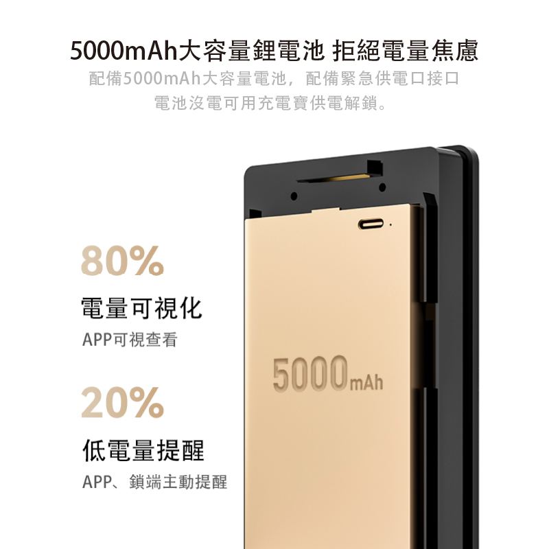 視訊鏡頭具備紅外線功能,可全天候看清門外視野,支援AI人臉識別演算法,能辨識各種面容資訊,下次使用時能更快速完成辨識,鎖體內建5,000mAh大容量鋰電池,充滿一次電約可使用 60 天,當電量過低時,手機App自動推播低電通知,內、外門鎖採用鋁合金材質,面板表面強化鏡面玻璃。同時搭配全黑配色,給人一種低調奢華的感覺,適用市面上絕大多數的門扇。